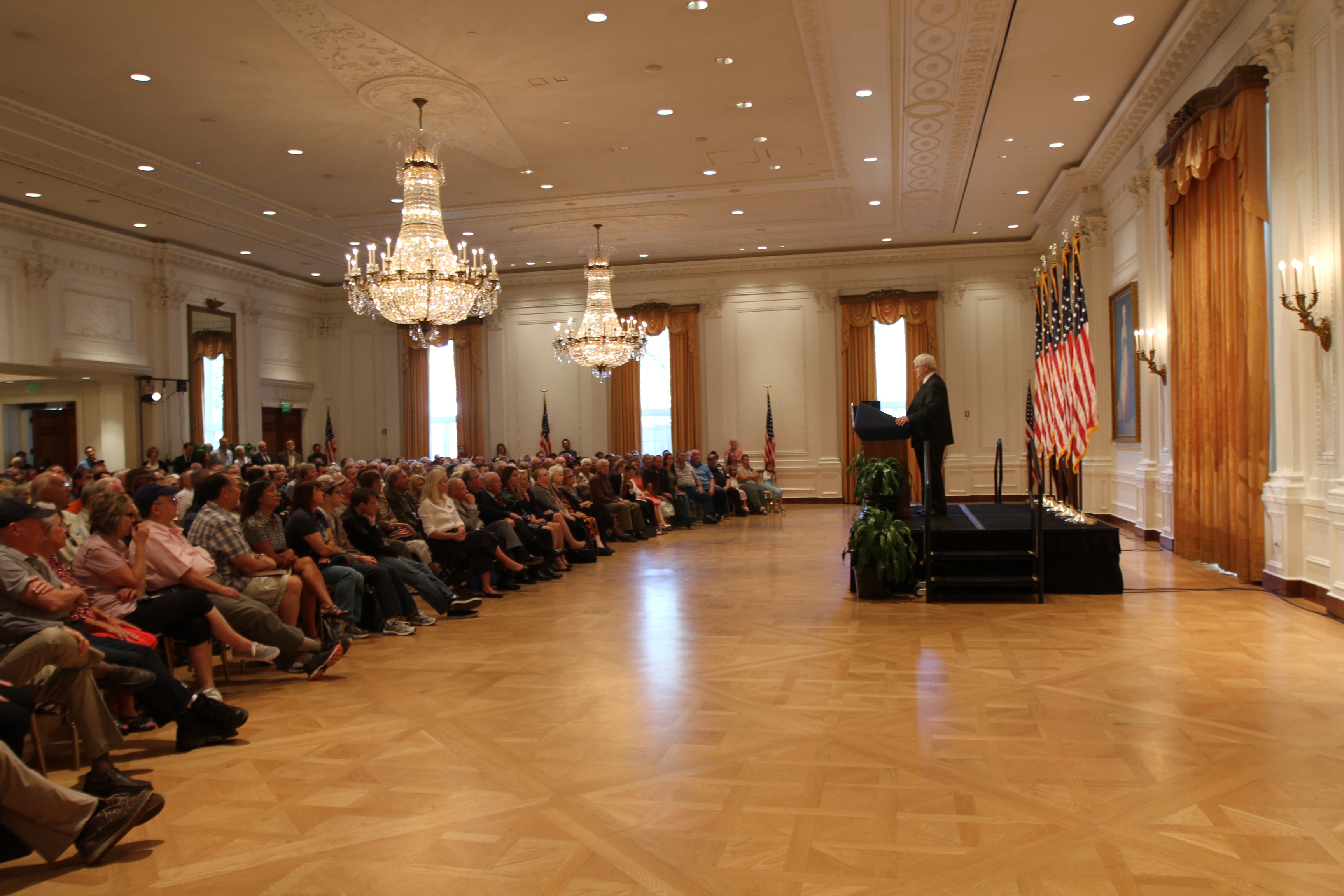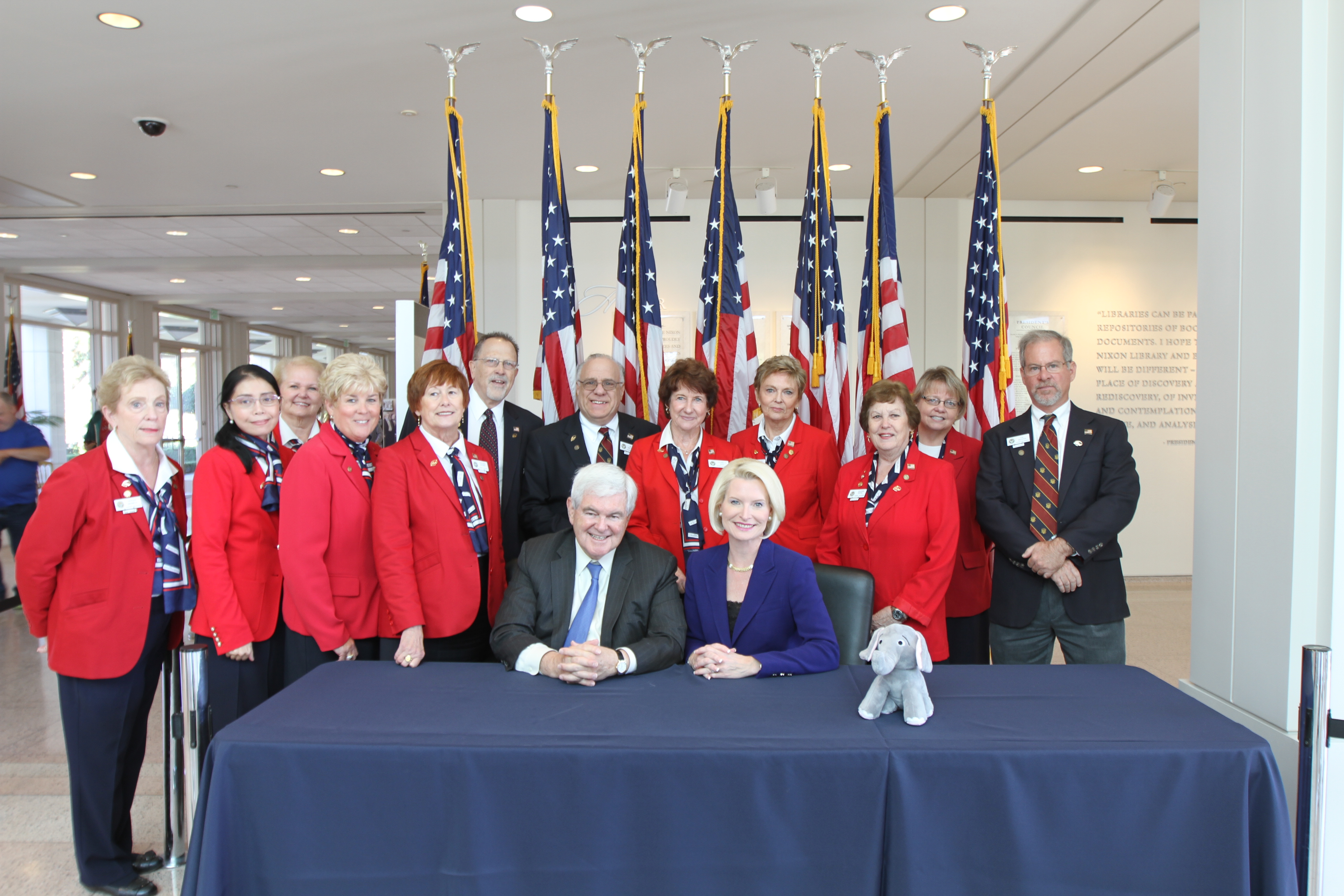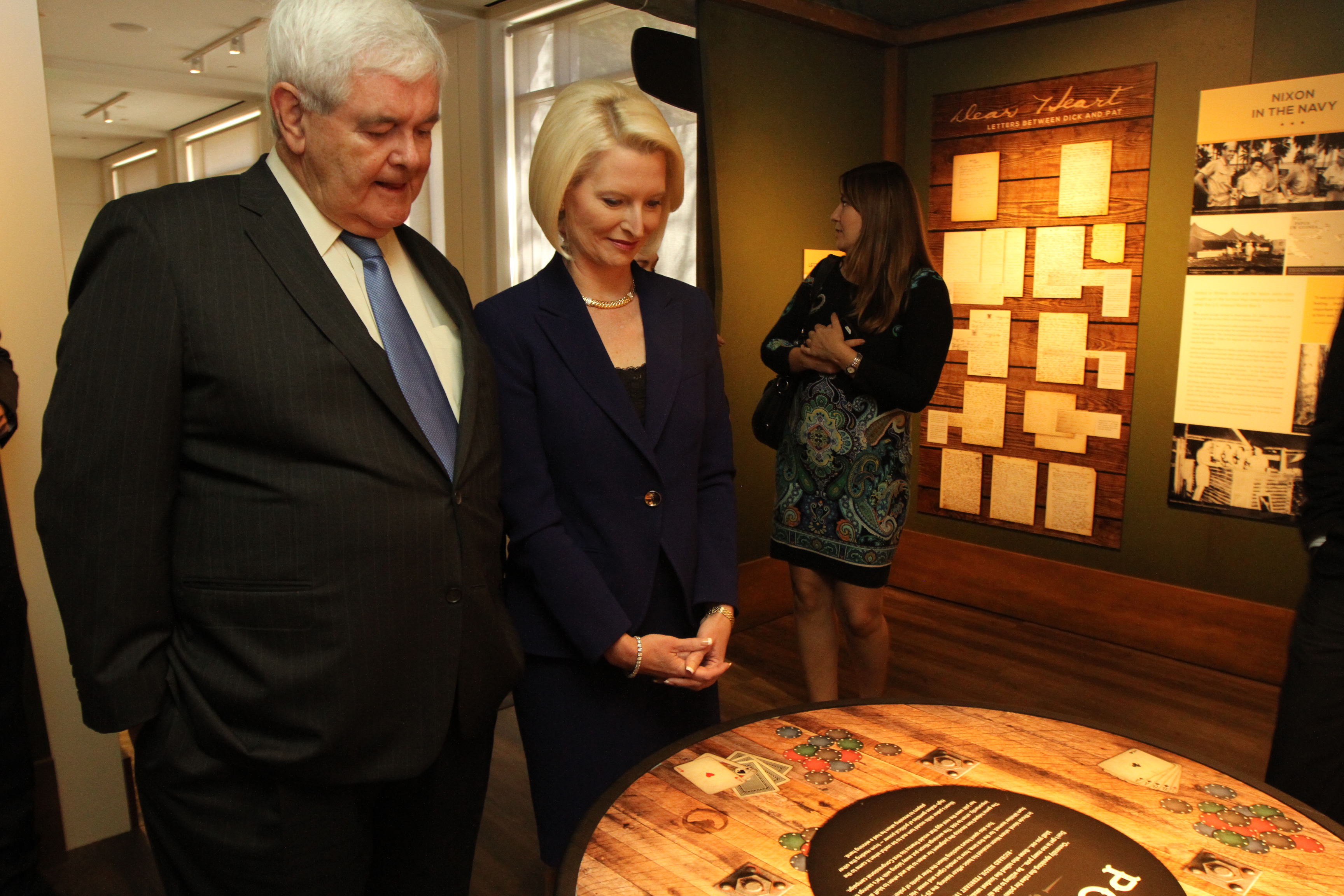 Former Speaker of the House Newt Gingrich and wife Callista returned to the Nixon Library on Wednesday, October 19, for a special East Room talk. Before a full house of over 700, Gingrich payed homage to Richard Nixon’s political career and accomplishments while offering insider analysis of the current presidential election. Before his talk, Mr. Gingrich toured the newly renovated exhibits at the Nixon Library.