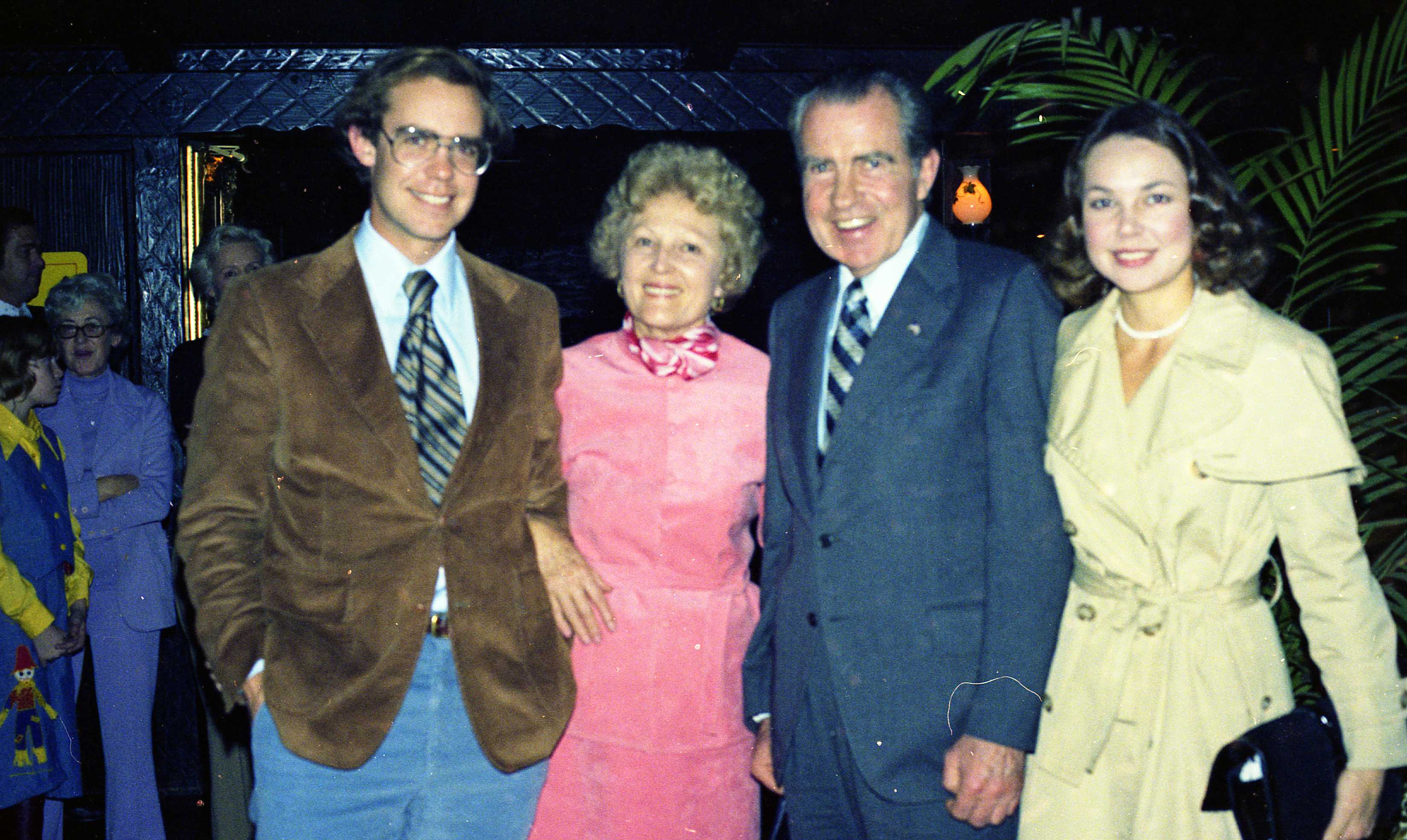 Richard Nixon, Pat Nixon, Julie Eisenhower, David Eisenhower, and others attend Nixon’s 65th birthday dinner at El Adobe Restaurant.