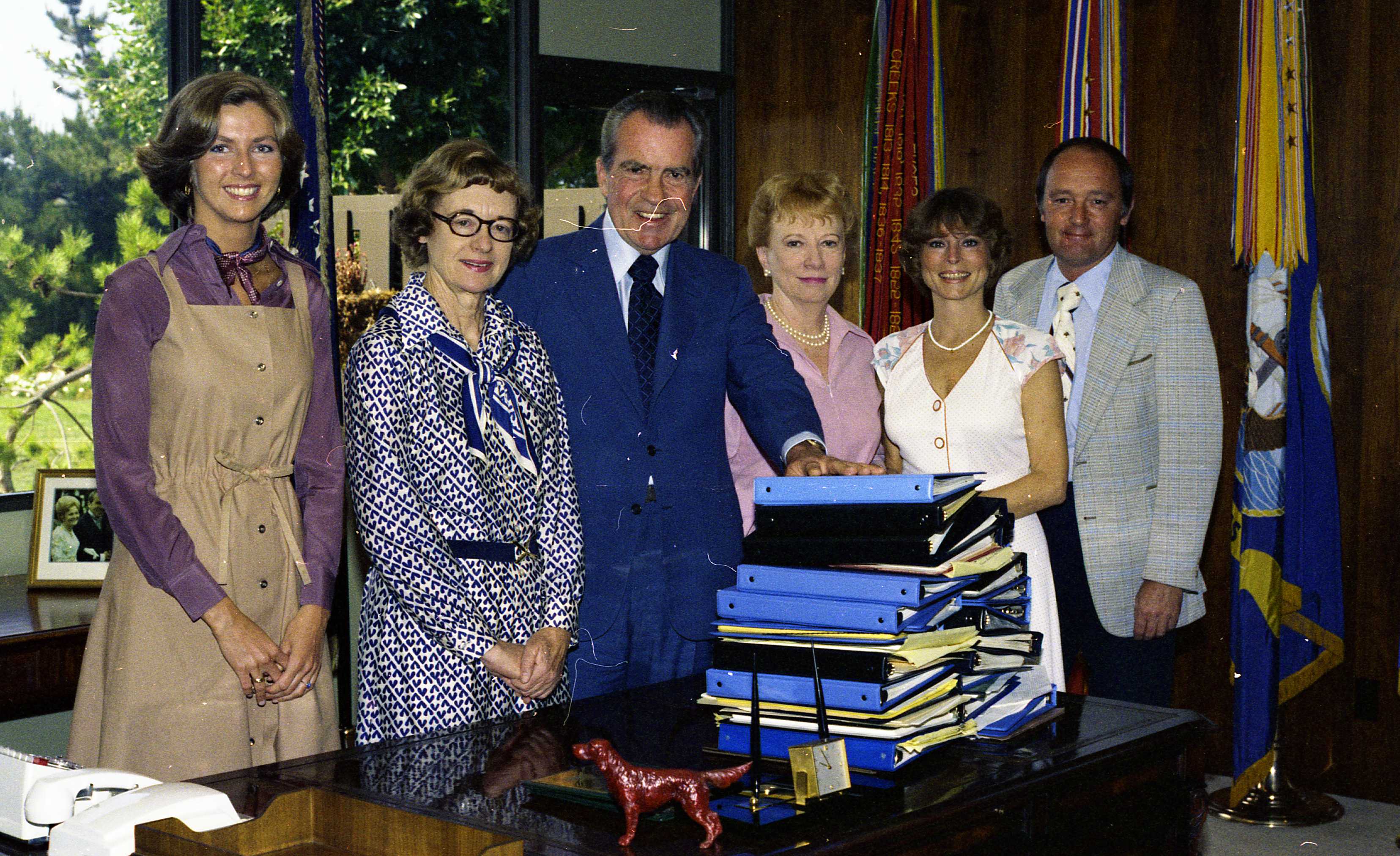 Richard Nixon, Rose Mary Woods, Cathy, Loie Gaunt, Marnie Pavlick, and Bob Dunn stand in back of a series of binders upon completion of Nixon’s memoirs.