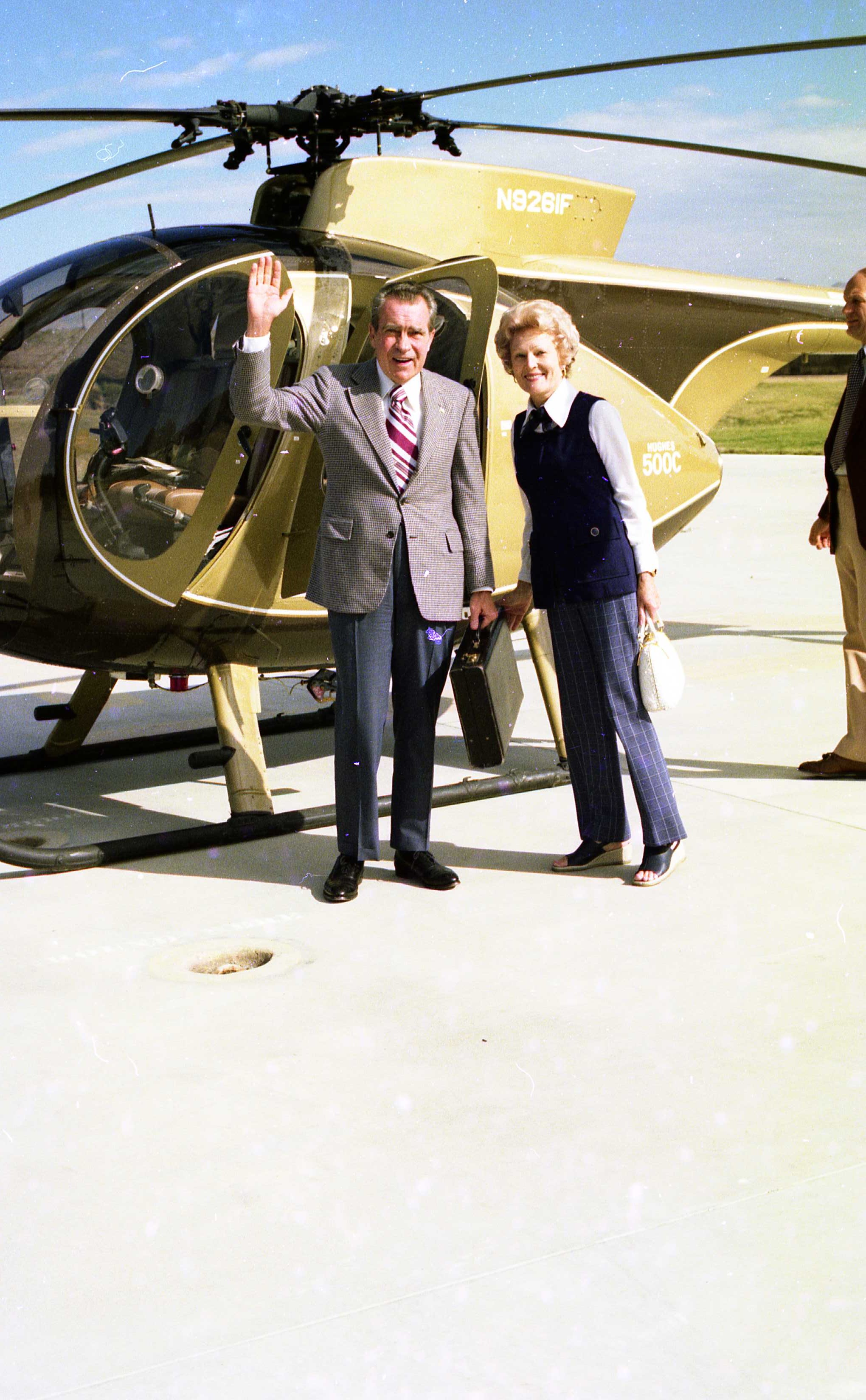 Richard Nixon and Pat Nixon board a helicopter bound for Palm Springs.