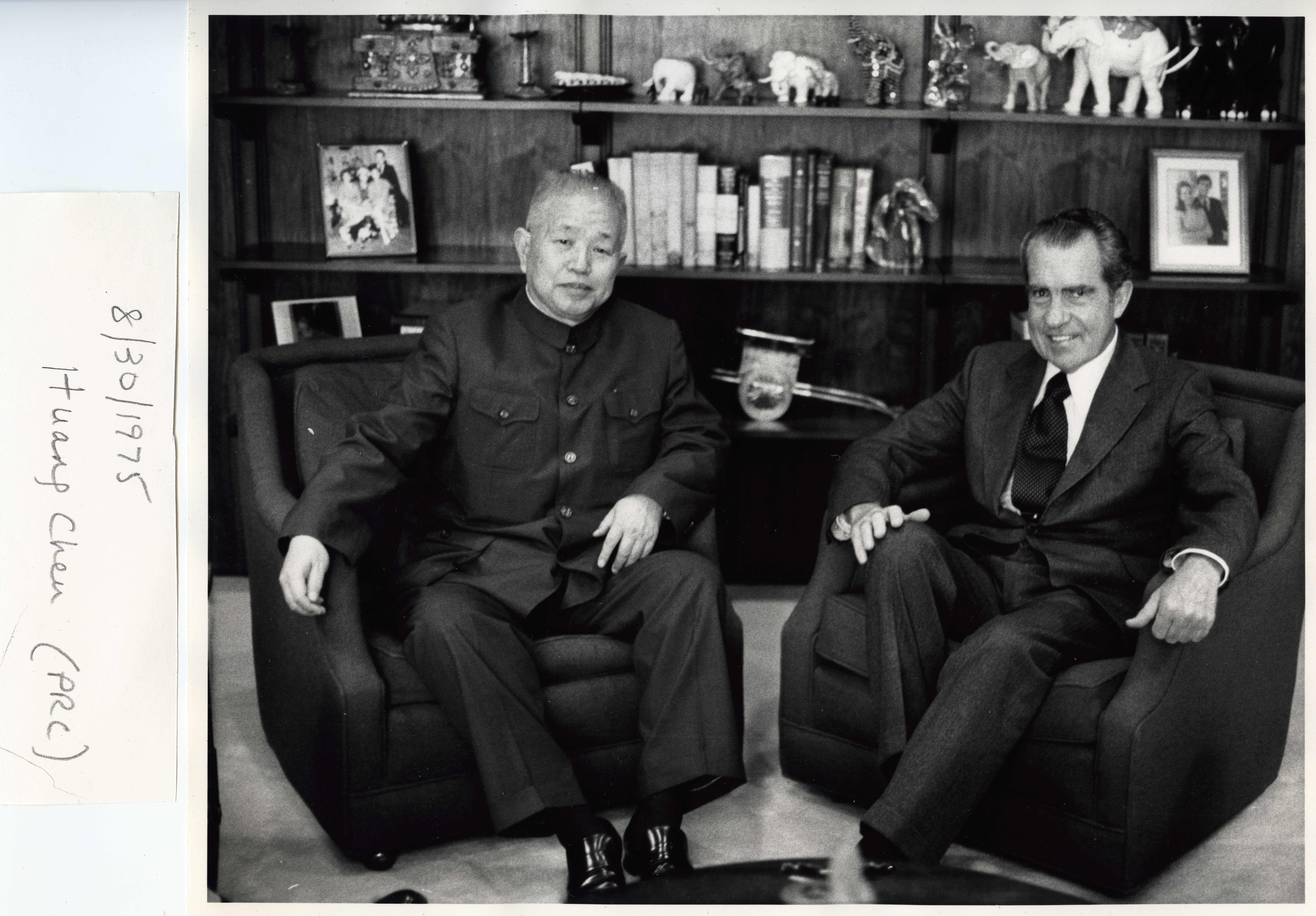 Richard Nixon seated with Huang Chen, former ambassador and the current Minister of Culture of the Peoples Republic.