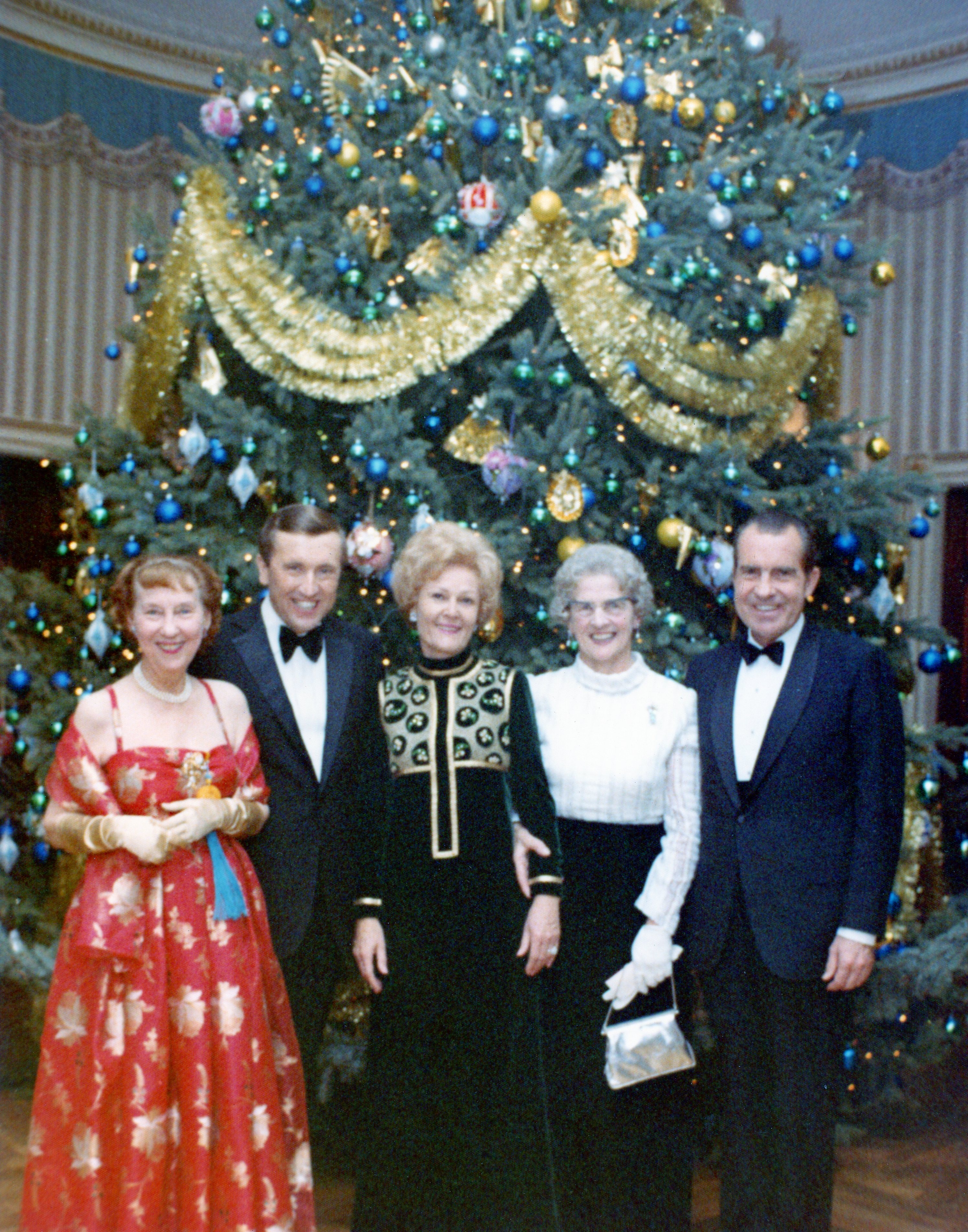 Richard Nixon, Pat Nixon, David Frost, and Mamie Eisenhower stand in front of White House Christmas Tree during David Frost’s Christmas Eve program at the White House.