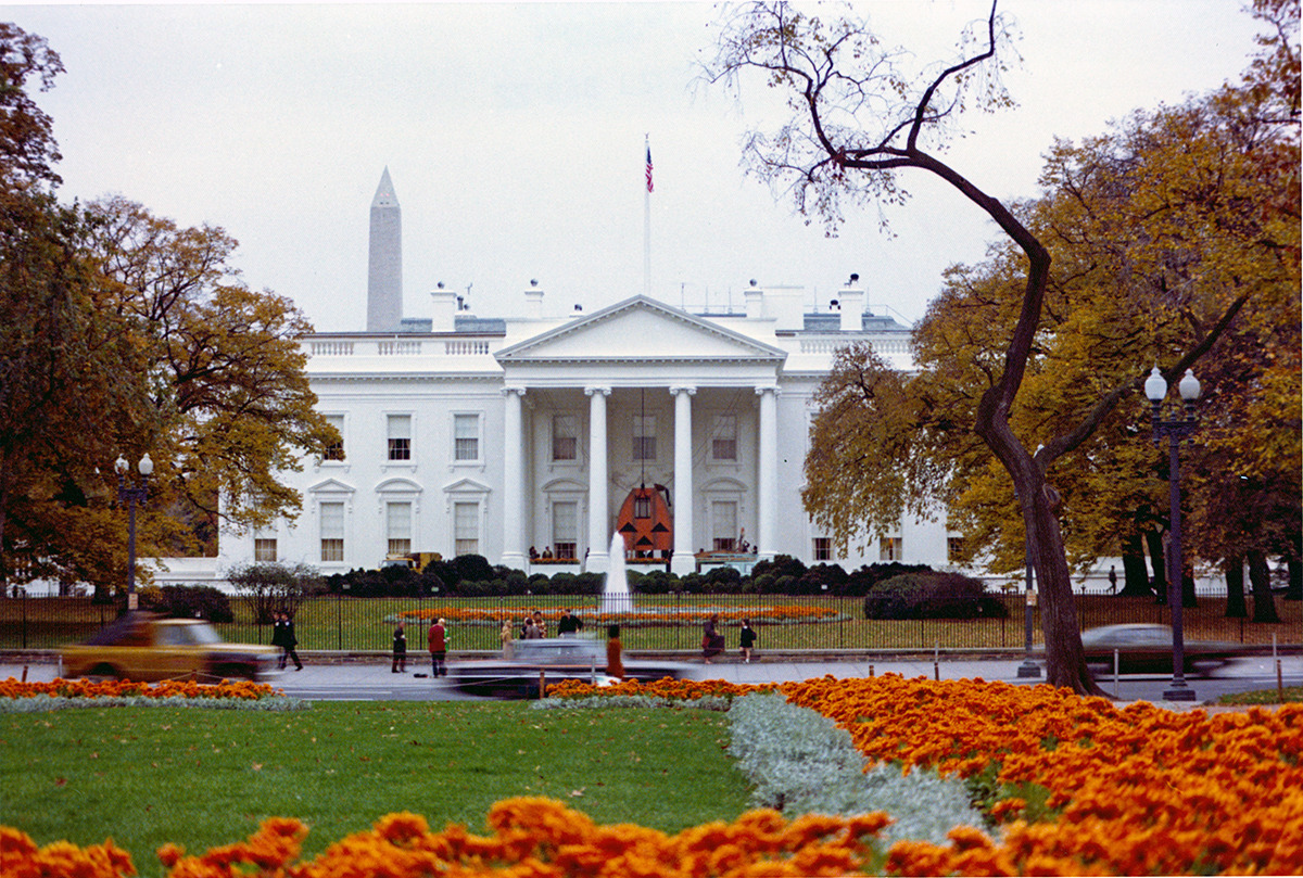 The familiar white plaster molding of the regal White House north entrance door was gone. In its place was a smiling, two-story pumpkin, a cloth image wrapped over a 17-foot high plywood platform that reached to the second floor of the mansion.