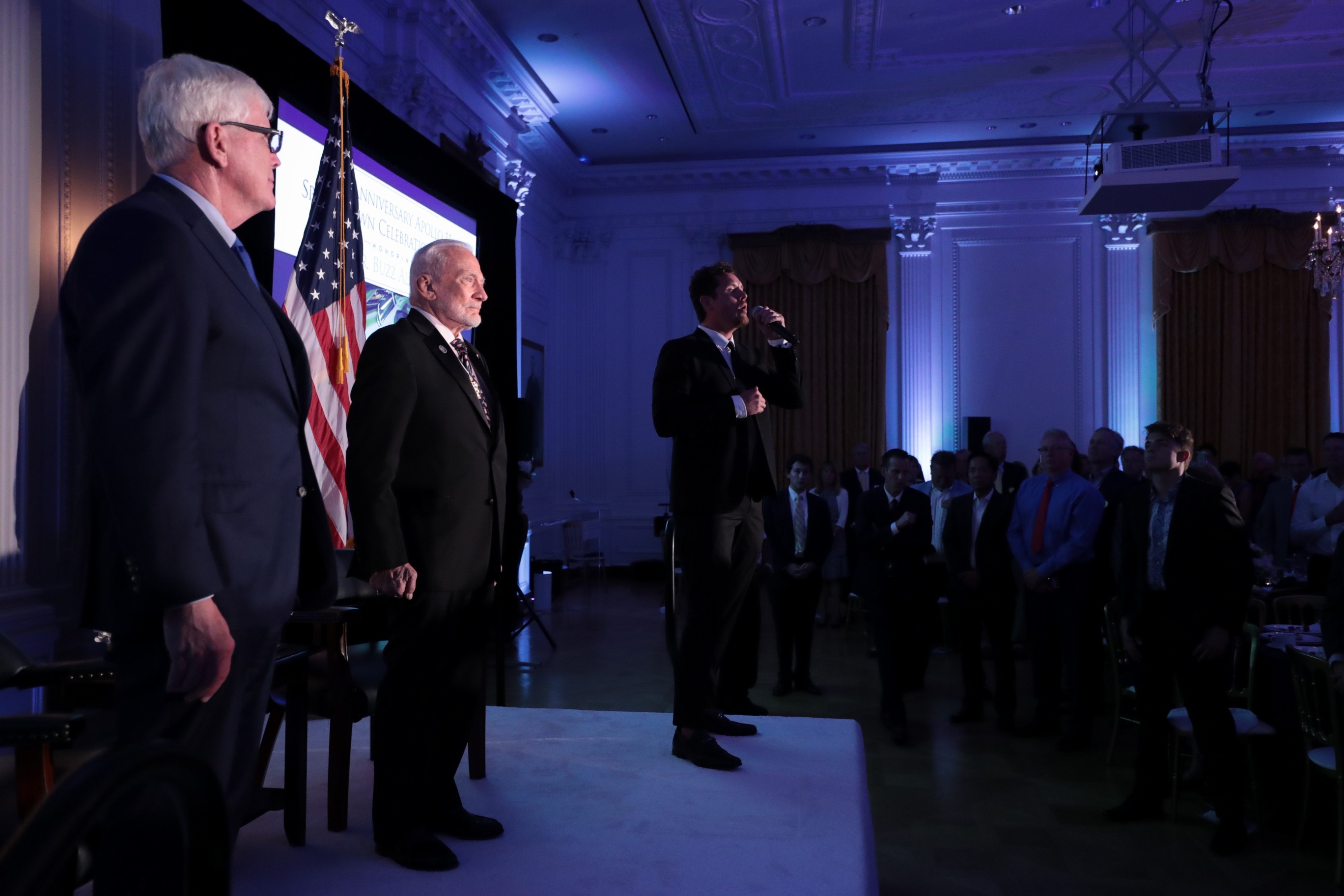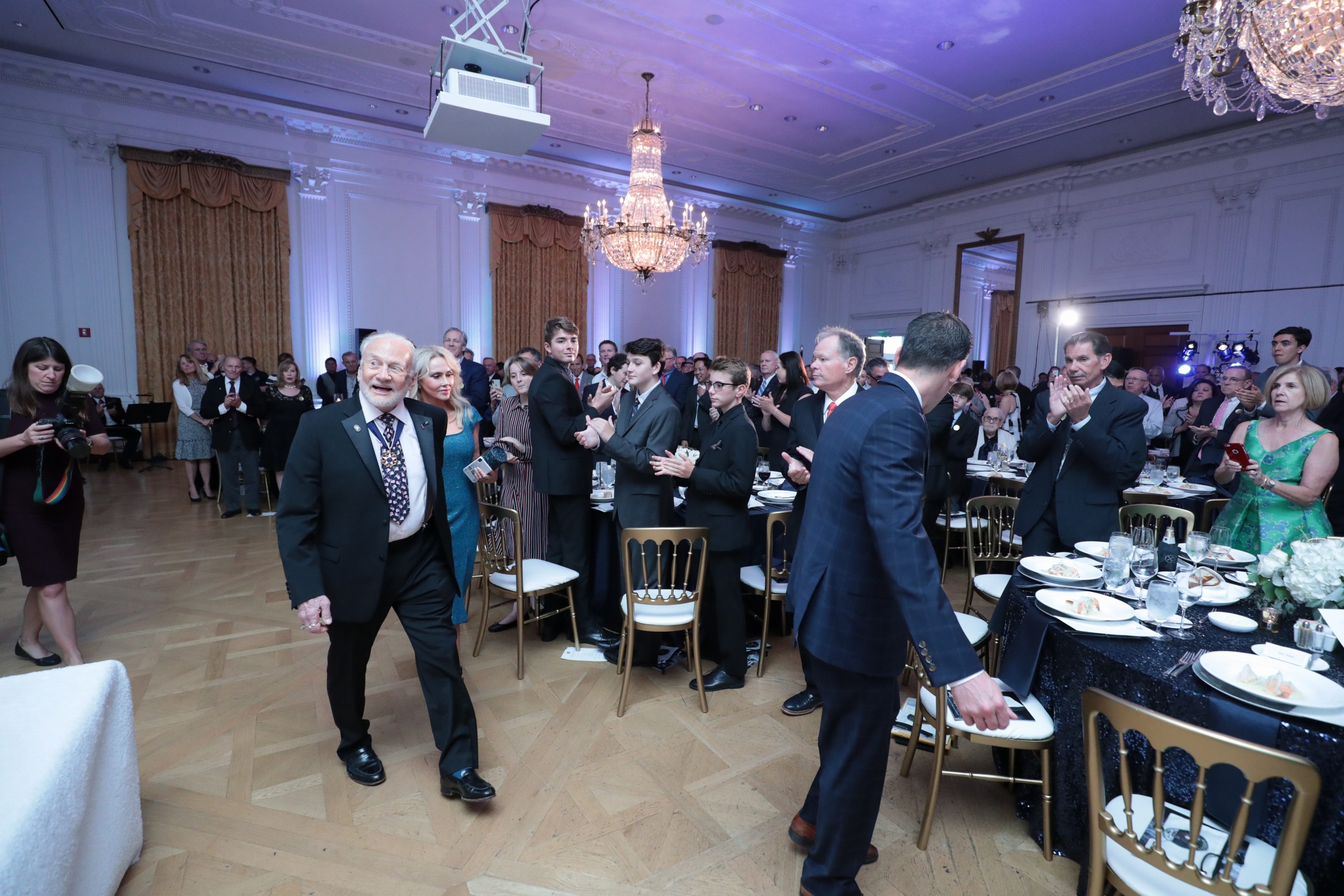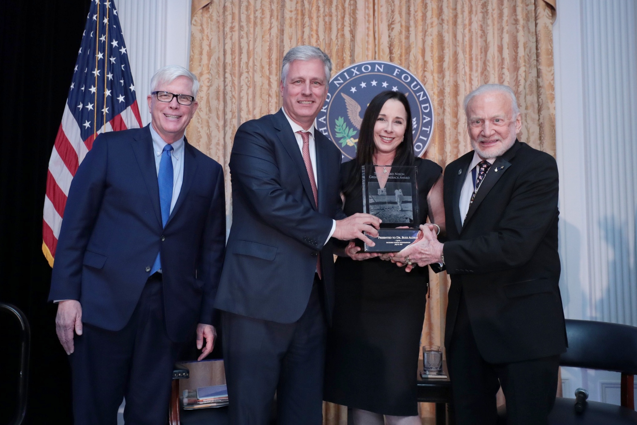 Nixon Foundation President Hugh Hewitt, newly elected board director Lisa Argyros and Ambassador Richard O’Brien presented the award. O’Brien is a long-time friend and attorney of Mr. Aldrin, and currently serves as President Trump’s special envoy for hostage affairs.