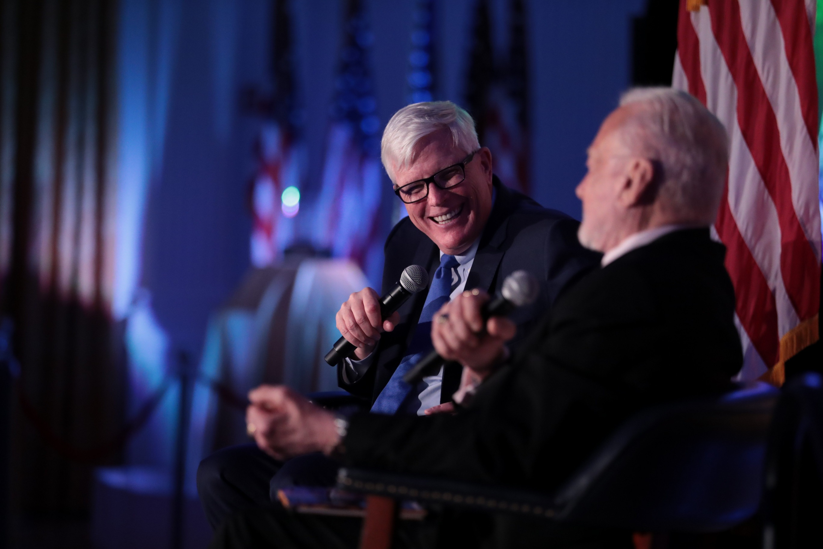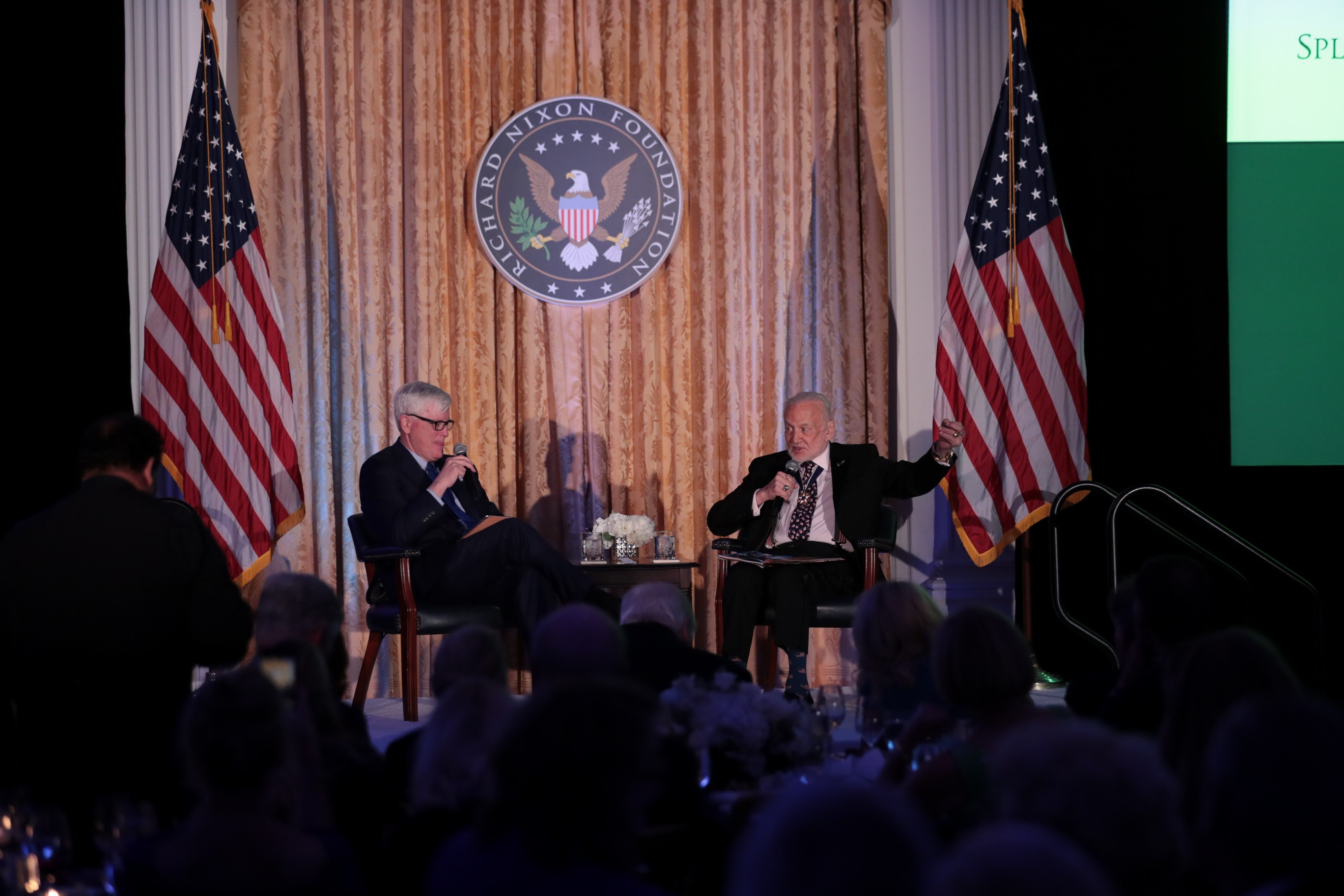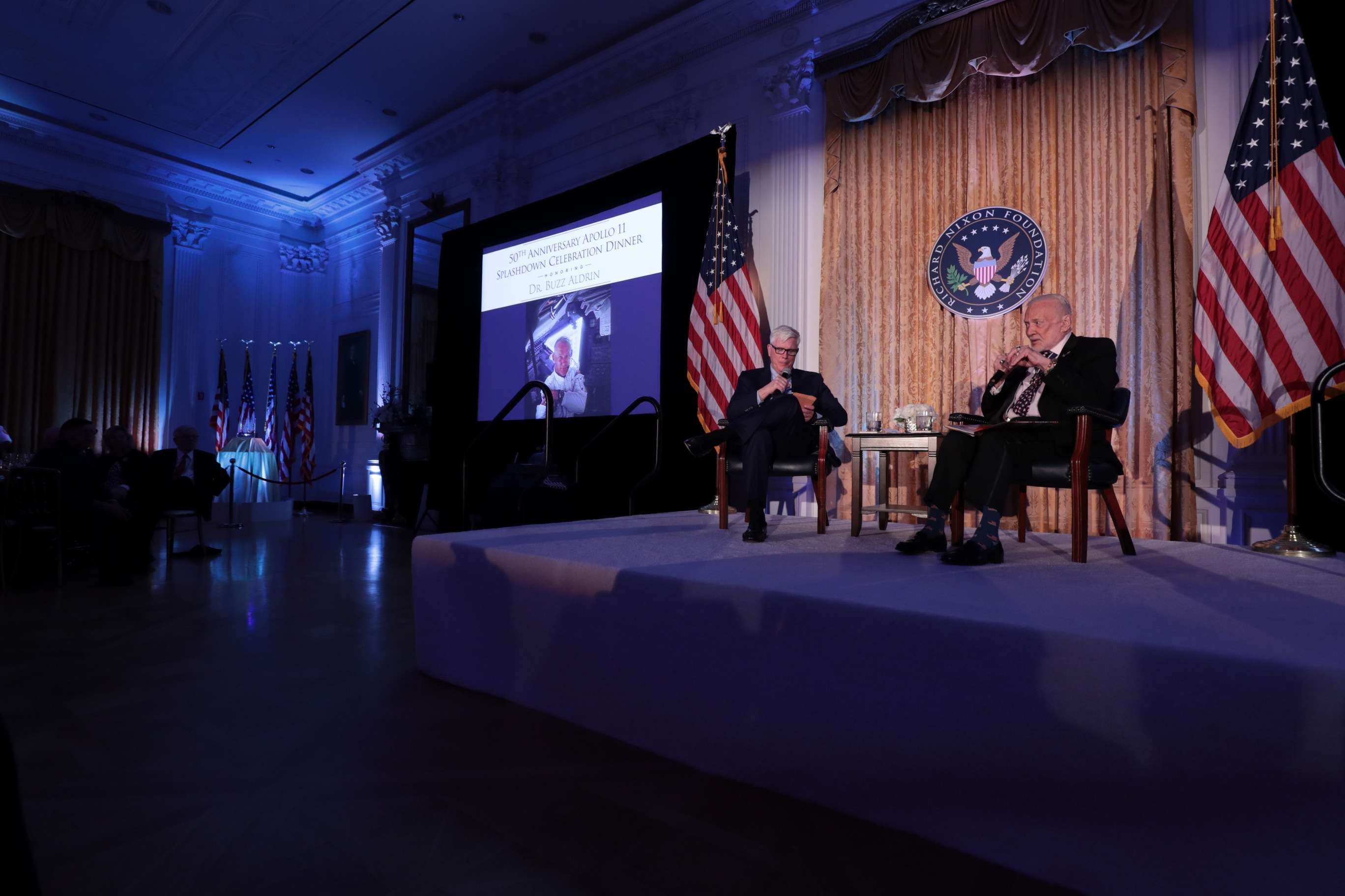 Hundreds of Nixon Library supporters came to the East Room dinner, and hear Aldrin in conversation with Hewitt. Aldrin discussed his formative years, education, and service to the country that culminated in the historic moon landing.
