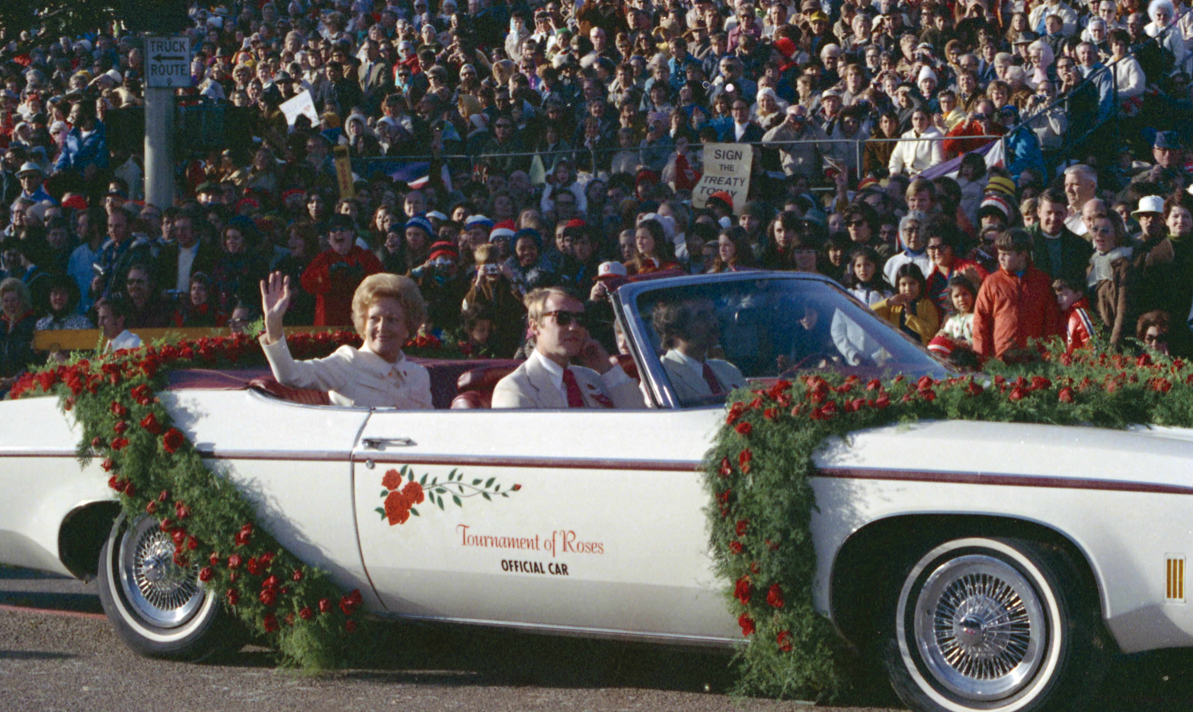 Pat Nixon riding in the 1973 Rose Bowl Parade, following the USC band and leading the Trojan float. The first lady was escorted by the president of USC, Dr. John Hubbard, and his wife, Lucy