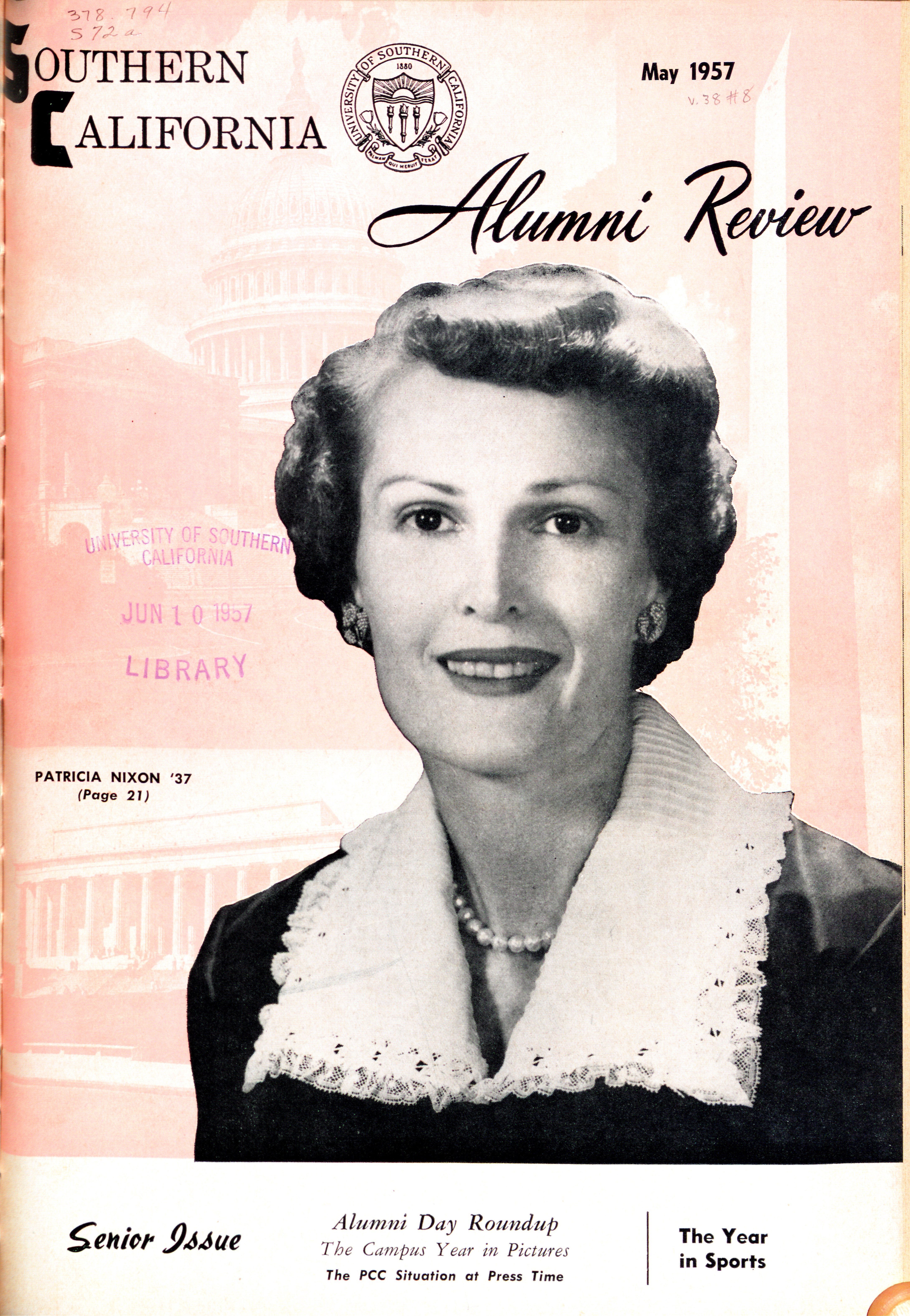 Pat Nixon again gracing the cover of “Southern California Alumni Review” after beginning her second term as Second Lady of the United States. This May 1957 article discussed Pat Nixon being awarded the Asa V. Call trophy, the highest honor from USC