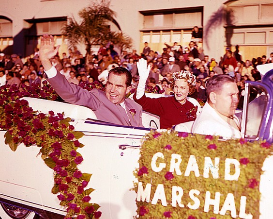 Vice-president, and presidential candidate, Richard Nixon, and Pat Nixon riding in the 1960 Rose Parade. Richard Nixon served as Grand Marshall in 1953 and 1960, the only person to serve as Grand Marshall twice in eight years