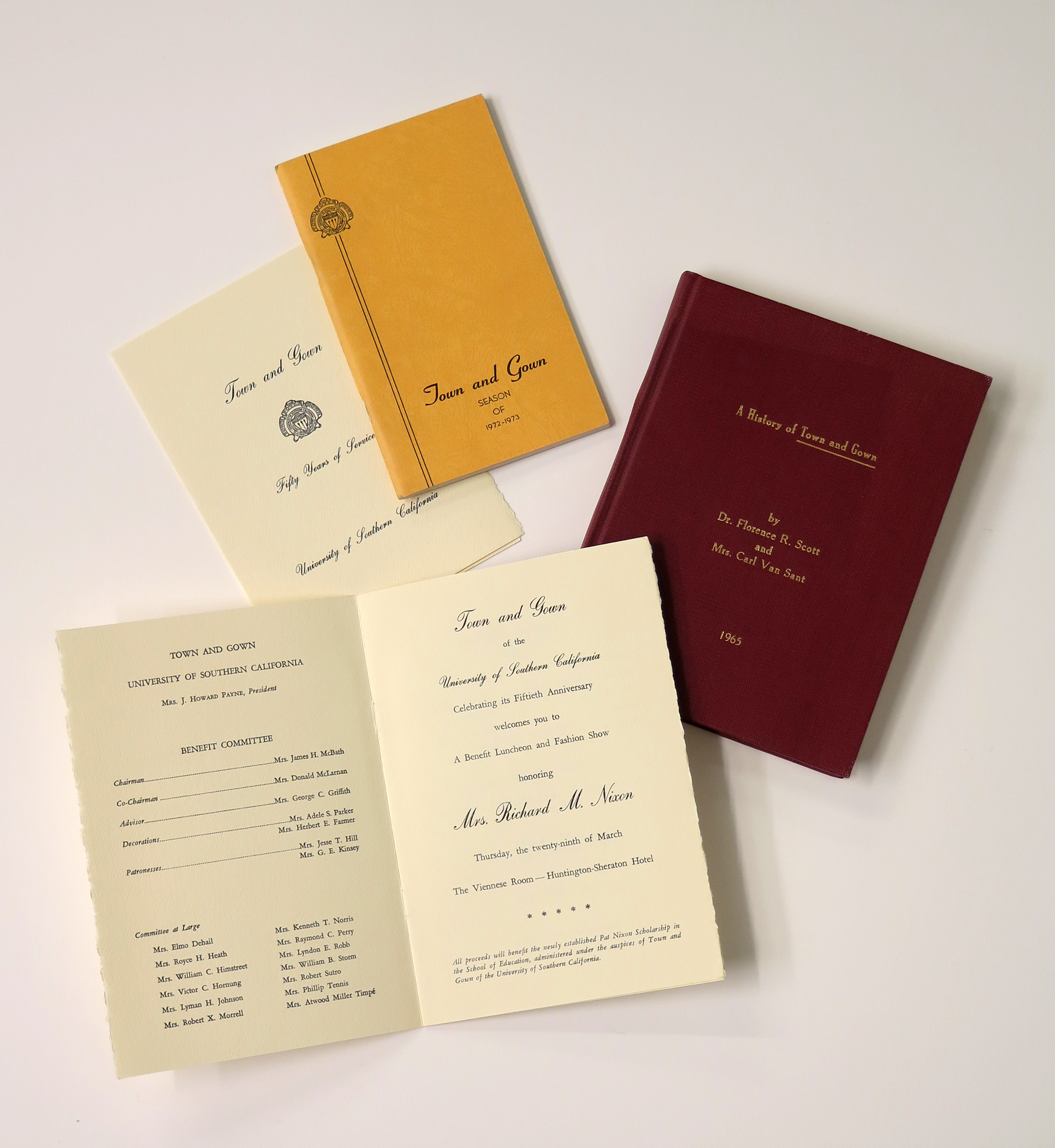 Pictured top to bottom, left to right: Invitation for a Benefit Luncheon and Fashion Show celebrating 50 years of service to the University of Southern California honoring Mrs. Richard M. Nixon, March 29, 1973; Member Directory, Season of 1972-1973; Program for a Benefit Luncheon and Fashion Show honoring Mrs. Richard M. Nixon, March 29, 1973; Book titled “A History of Town and Gown” by Dr. Florence R. Scott and Mrs. Carl Van Sant, 1965.