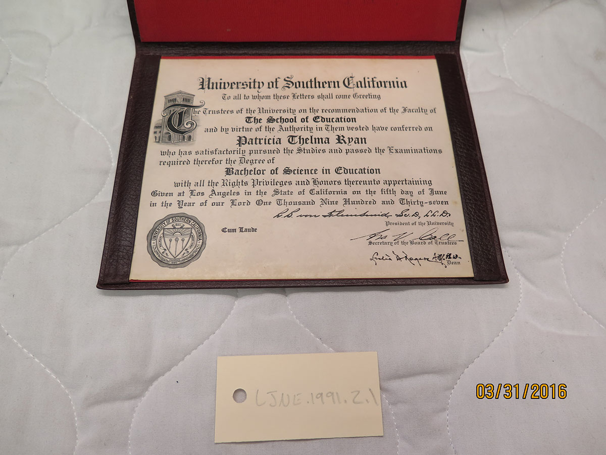 In the fall of 1934, Pat entered the University of Southern California – a dream of higher education finally coming to fruition. Pat qualified for a research fellowship, much like today’s work-study programs which covered her tuition. Unfortunately, it was not enough to live on. Over the course of her years at USC, Pat held a variety of jobs to help meet expenses. She worked as a salesgirl at Bullocks – a fashionable department store in Los Angeles – and as a Hollywood movie extra. Three years after beginning her studies at USC, Pat Ryan graduated with honors and an equivalent to a Master’s Degree in Education.