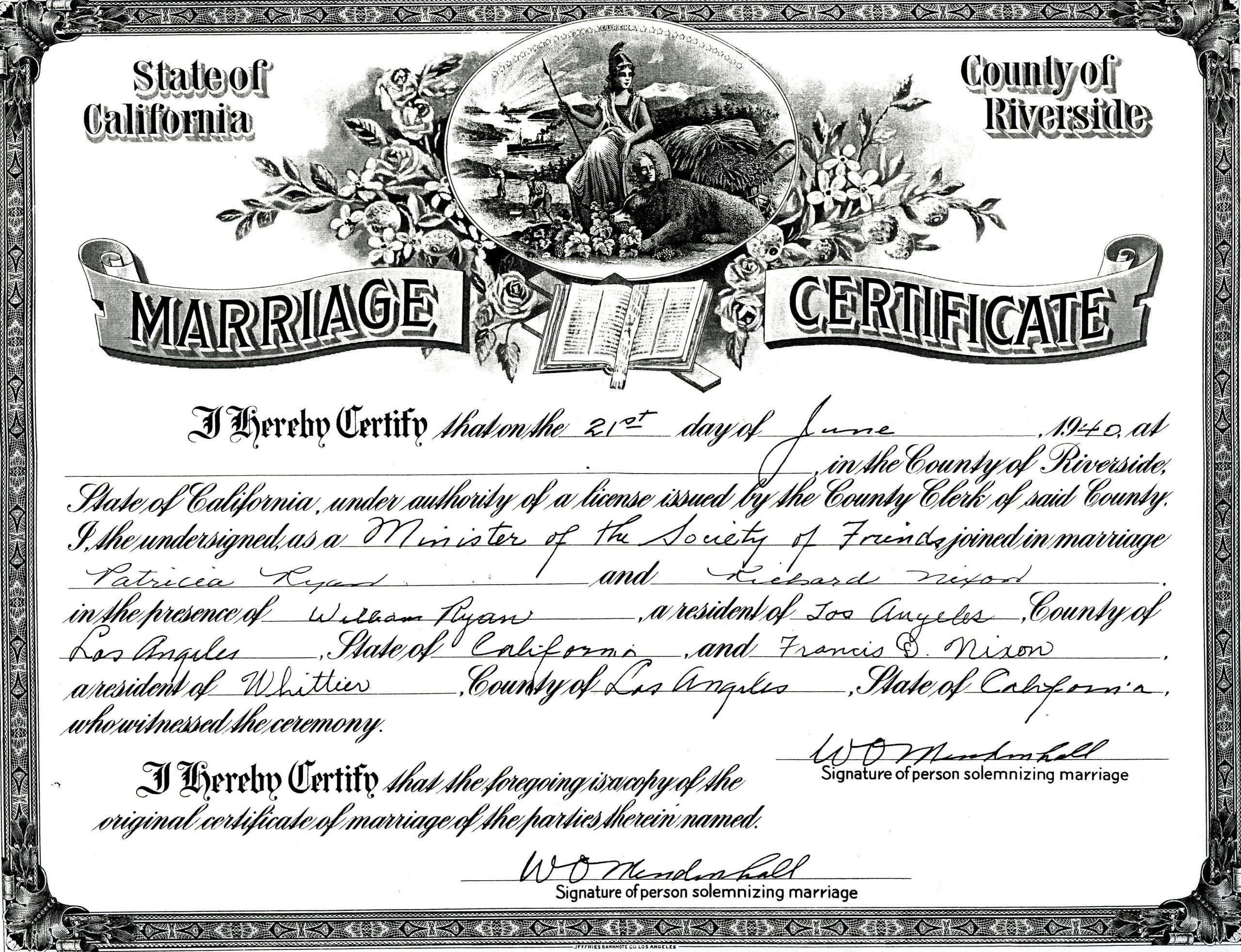 On June 21, 1940, Pat Ryan married Richard Nixon in a small ceremony at the Mission Inn in Riverside, California. The Couple exchanged vows in from of a Quaker minister with only family and a dozen friends in attendance.