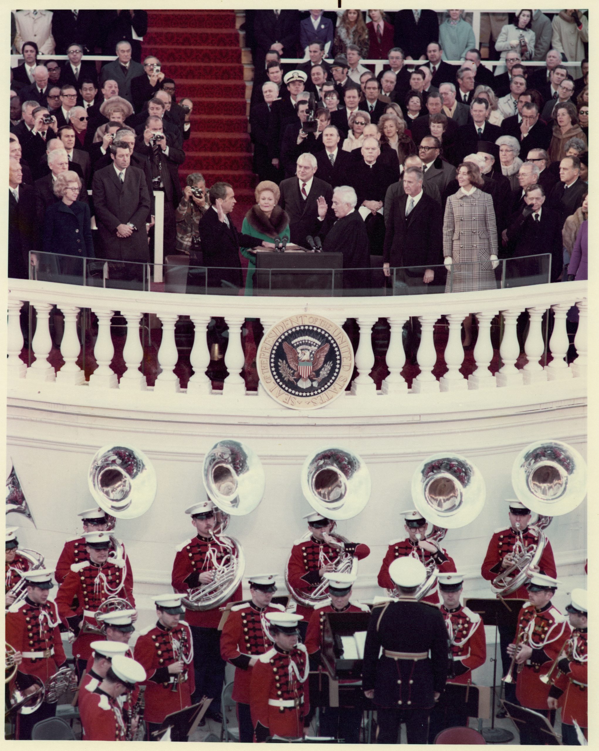 As her husband, Richard Nixon, took the oath of office as President of the United States, Pat Nixon held the Nixon and Milhous family bibles.